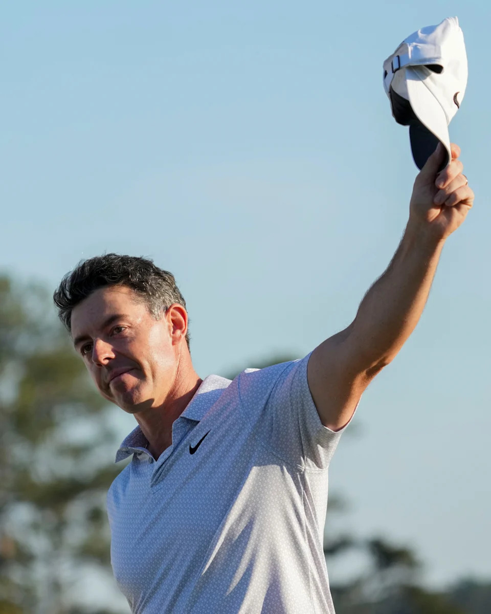 Rory McIlroy waves to patrons after walking off the 18th green during the second round of the Masters Tournament at Augusta National Golf Club.