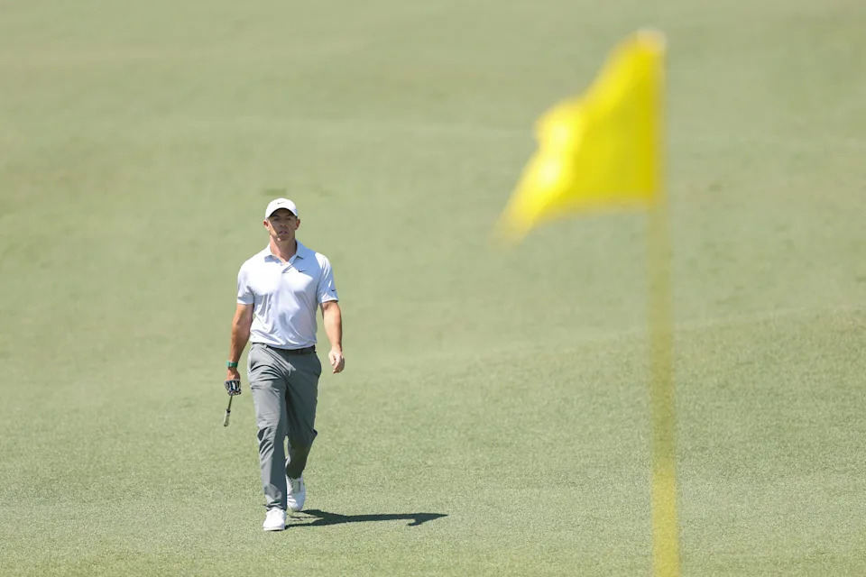 Rory McIlroy of Northern Ireland puts a club back in his bag during the second round of the 2026 Masters Tournament at Augusta National Golf Club on April 10, 2026, in Augusta, Georgia.