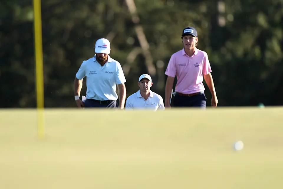 Rory McIlroy, Cameron Young, and Mason Howell, walk down the first fairway during the second round of the Masters Tournament at Augusta National Golf Club.