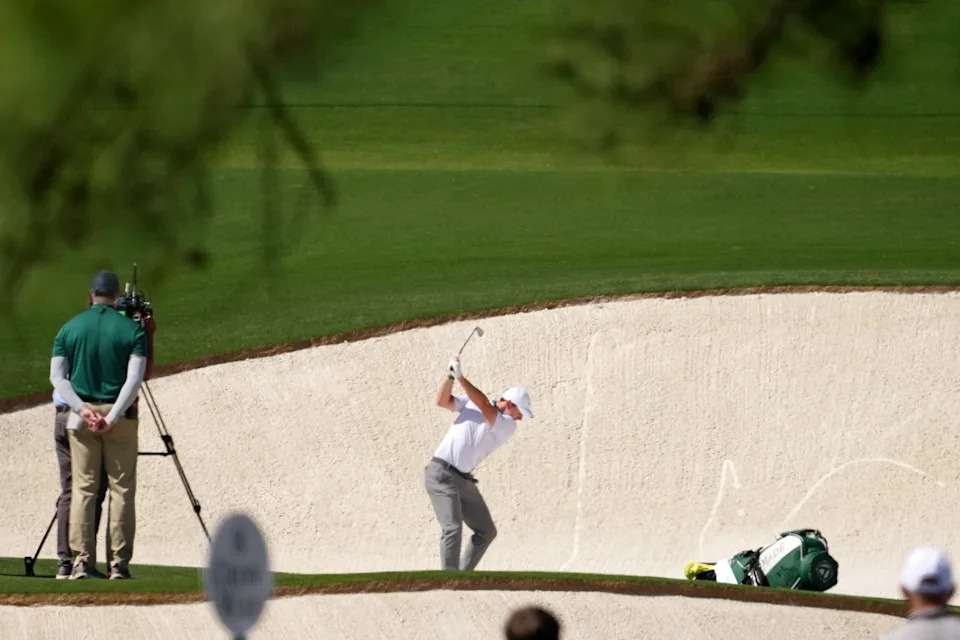 Rory McIlroy of Northern Ireland plays a shot from a bunker on the eighth hole during the second round of the 2026 Masters Tournament at Augusta National Golf Club on April 10, 2026, in Augusta, Georgia.