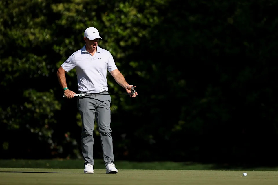 Rory McIlroy of Northern Ireland reacts on the 11th green during the second round of the 2026 Masters Tournament at Augusta National Golf Club on April 10, 2026, in Augusta, Georgia.