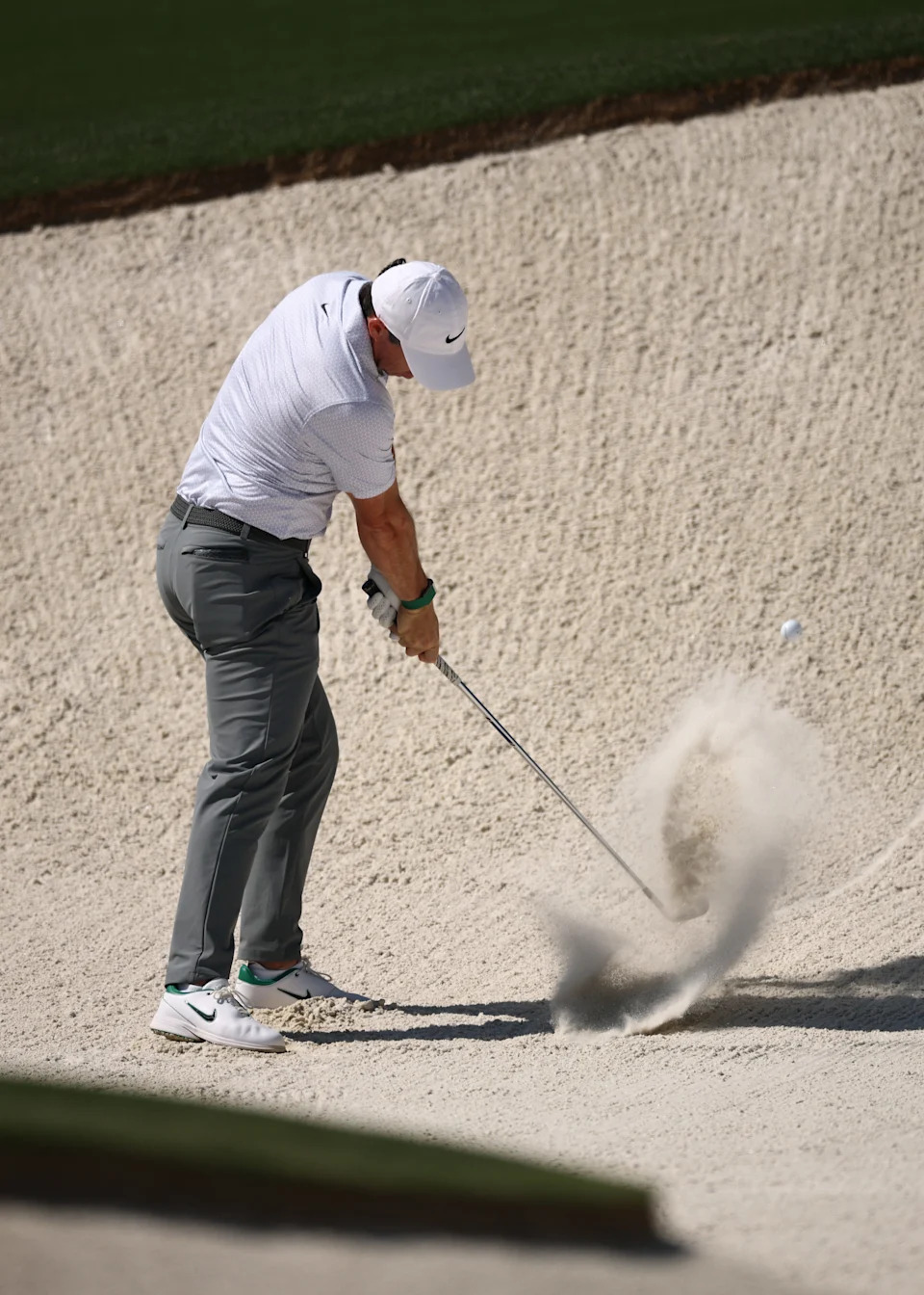 Rory McIlroy plays a shot from a bunker on the seventh hole during the second round of the Masters Tournament at Augusta National Golf Club.