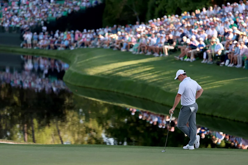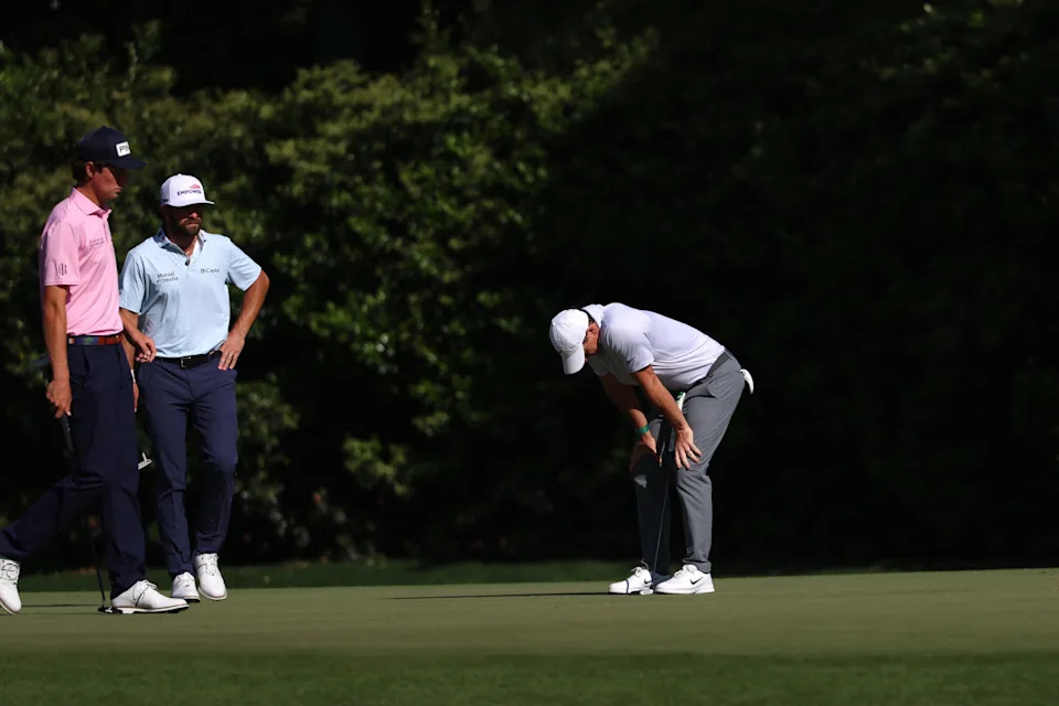 Rory McIlroy of Northern Ireland lines up a putt on the 15th green during the second round of the 2026 Masters Tournament at Augusta National Golf Club on April 10, 2026, in Augusta, Georgia.